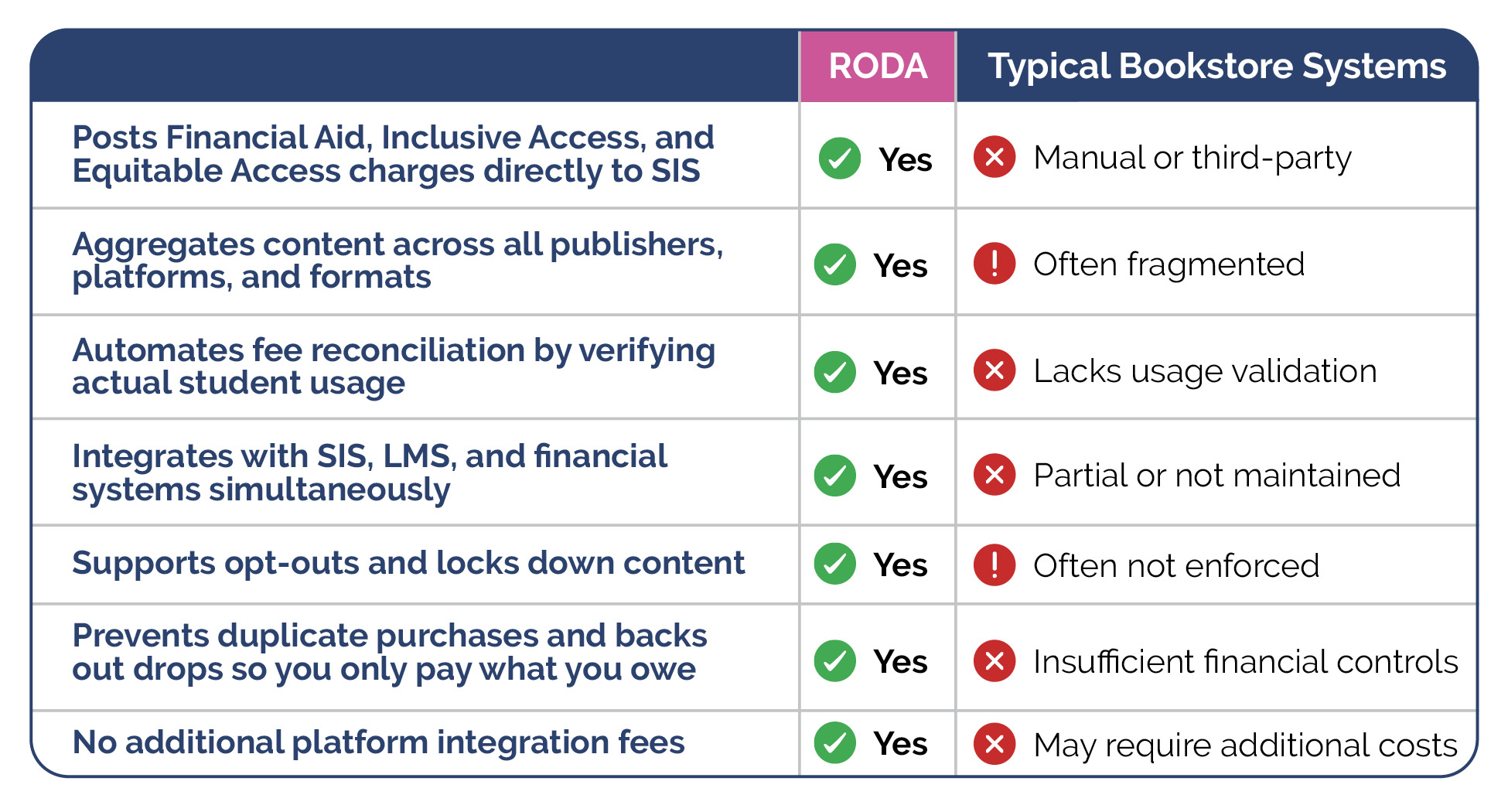 >RODA-Precision technology knows if a student has an active license or purchased an item for a previous class and prevents the student from being charged for a duplicate. RODA-Precision also knows if a student is no longer enrolled and backs out the course materials charge.